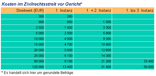 Bei einem Streitwert von 10 000 € betragen die Kosten vor Gericht in der 1. und 2. Instanz bereits rund 13 300 €.