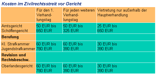 Dazu kommen noch Schreibauslagen, Portokosten und natürlich die Mehrwertsteuer. Diese Gebühren können mehrfach erhoben werden (z.B. eine für den Prozess; eine für die Verhandlung; eine für die Vertretung im Beweisaufnahme-Verfahren; eine für die Mitwirkung beim Abschluss eines Vergleichs). Auch die gegnerische Seite hat diese Kosten, die bei einem verlorenen Verfahren übernommen werden müssen.