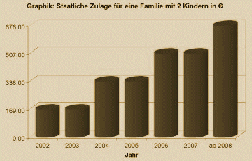Für jedes Kind, für das Anspruch auf Kindergeld besteht, gibt es einen weiteren Zuschuss in Höhe von 46 Euro in den Jahren 2002 und 2003, 92 Euro in den Jahren 2004 und 2005, 138 Euro 2006 und 2007, der auf 185 Euro ab dem Jahr 2008