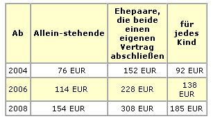 Der maximale Sonderausgabenabzug beträgt ab 2004=1.050 EUR, ab 2006=1.575 EUR und ab 2008=2.100 EUR. Der Sonderausgabenabzug steht dabei immer nur