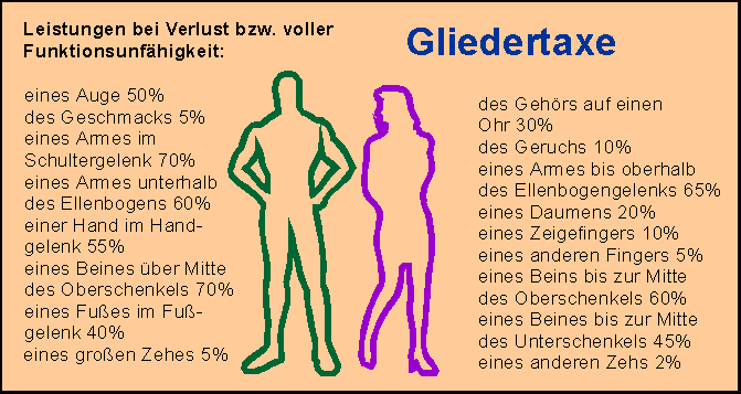 Der Grad der Invalidität wird über die jeweilige Gliedertaxe bestimmt. Wenn dies nicht möglich ist, wird die Beeinträchtigung gegenüber der normalen körperlichen oder geistigen Leistungsfähigkeit aus medizinischer Sicht her festgelegt.